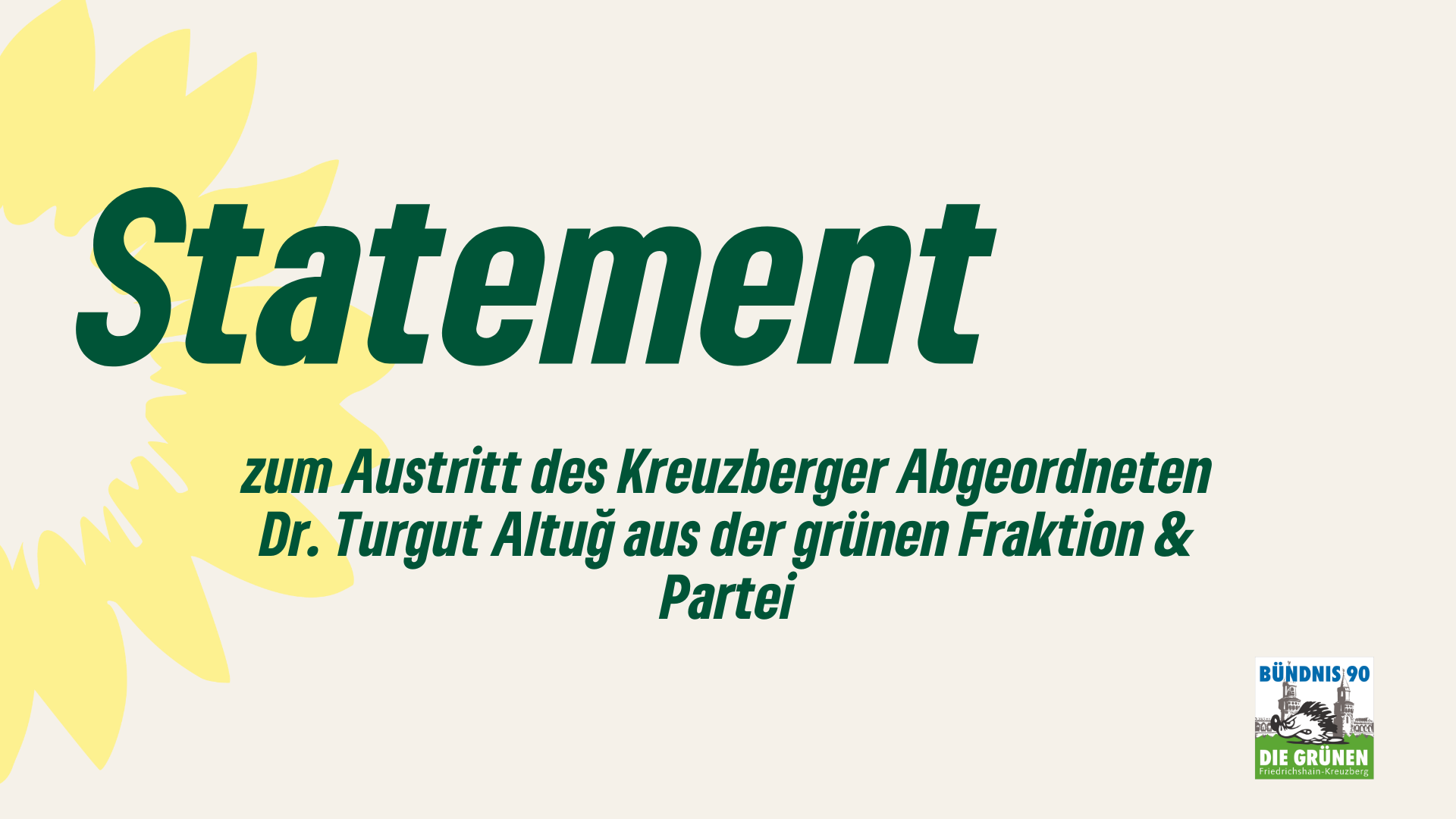 Überraschend wurden wir heute vom Kreuzberger Abgeordneten Dr. Turgut Altuğ darüber informiert, dass er die grüne Fraktion im Abgeordnetenhaus verlässt. Wir nehmen das als Kreisverband mit großem Bedauern zur Kenntnis. Wir sind Dr. Turgut Altuğ dankbar für seinen langjährigen Kampf für Bäume und die Natur in Berlin und wünschen ihm politisch und privat alles Gute.